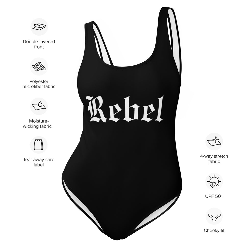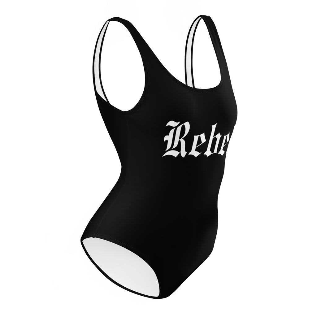 Make a splash with attitude in this bold black one-piece swimsuit featuring the word REBEL in striking Old English lettering across the front. Designed for the unapologetically edgy, this suit is perfect for rock queens, punk babes, and gothic mermaids who live by their own rules.