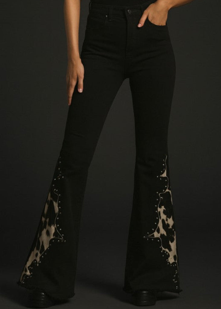 black bell bottom jeans studded cow print festival country rockstar wife concert outfit