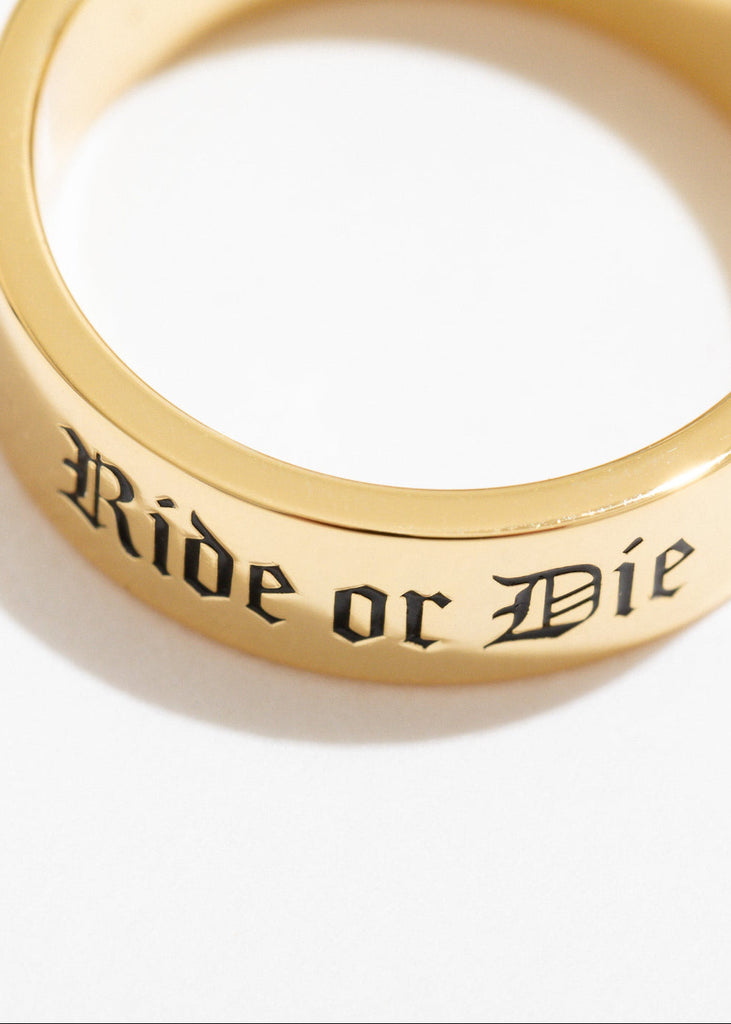 Gold ring with 'Ride or Die' engraving on a white background