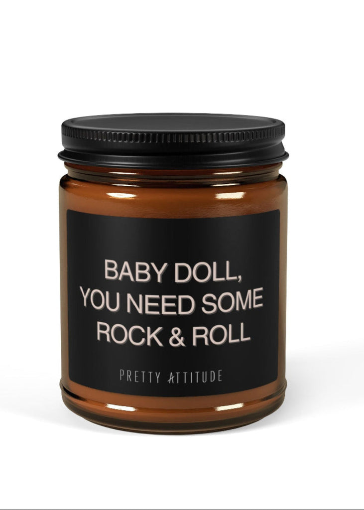 Light up your space with a bold statement! Baby Doll You Need Some Rock n Roll candle is housed in a sleek amber glass jar, designed to bring an edgy vibe to any room. Choose between 6 scents to achieve your desired effect or opt for the unscented candle if you need undisturbed ambience. All candles are compatible with ASTM safety standards, are made with 100% natural soy wax blend with a 100% cotton wick. These candles come in Amber jars for an extra atmospheric touch.