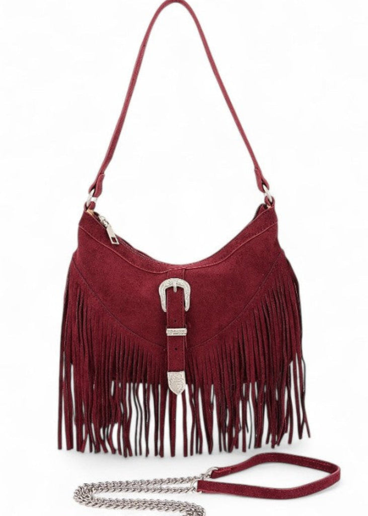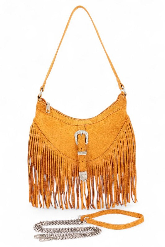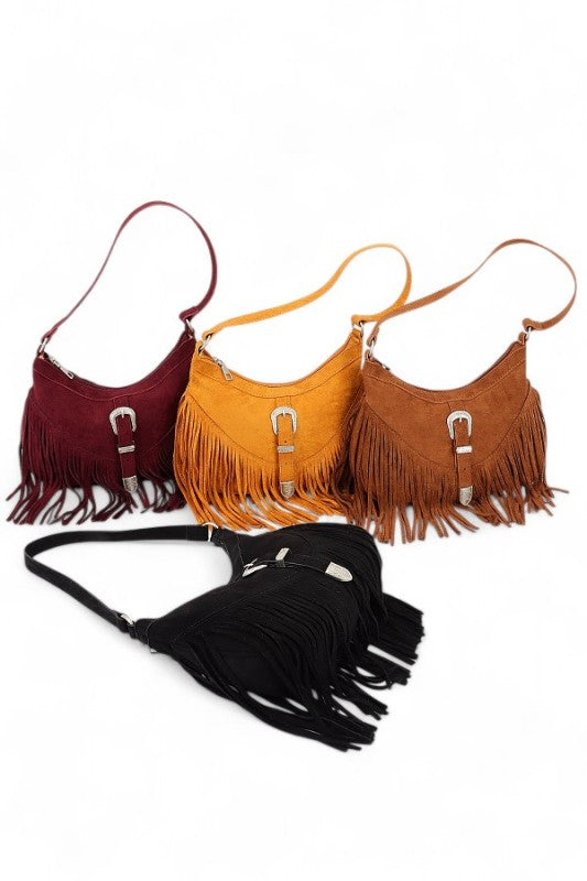 Channel your inner wanderer with this statement-making fringe bag that's equal parts vintage-inspired and utterly now. Crafted from buttery-soft faux suede, this beauty features cascading fringe that moves with you and an eye-catching Western buckle that adds just the right amount of edge.